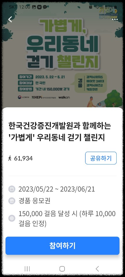 참여방법: 하루 최대 10,000 걸음 인정되고 150,000 걸음 달성 후 응모하기