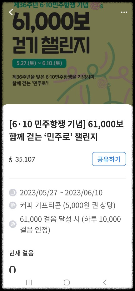 참여방법: 하루 최대 10,000 걸음 인정되고 61,000 걸음 달성 후 인증샷 게시